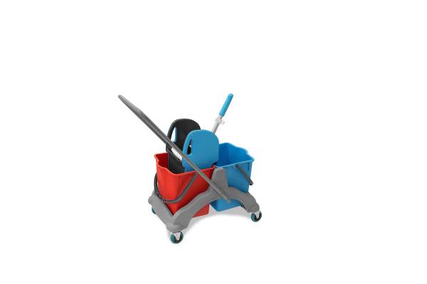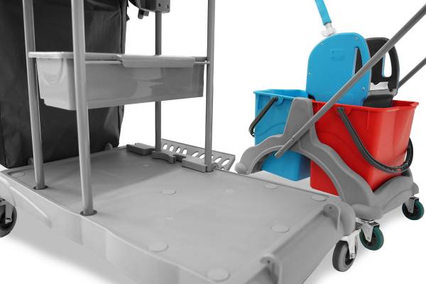 Der Reinigungswagen mit aufgesetztem Doppelfahrwagen verfügt über 2 große Kunststoff-Eimer (18 Liter) mit Mopp-Presse am eigenständig fahrendem Doppelfahrwagen und 2 kleine Kunststoff-Eimer (5 Liter) am Hauptwagen (Reinigungswagen) in den Farben rot und blau.