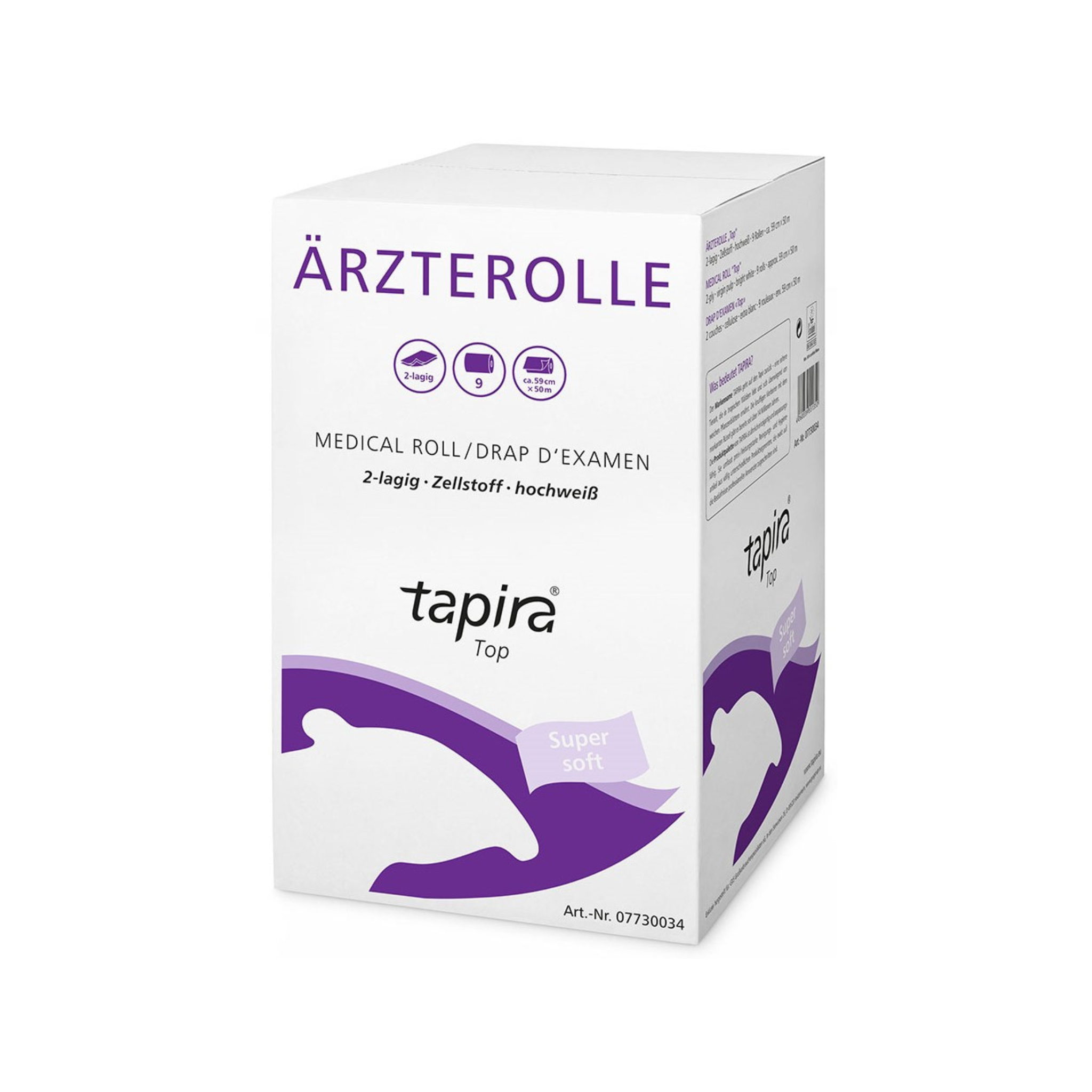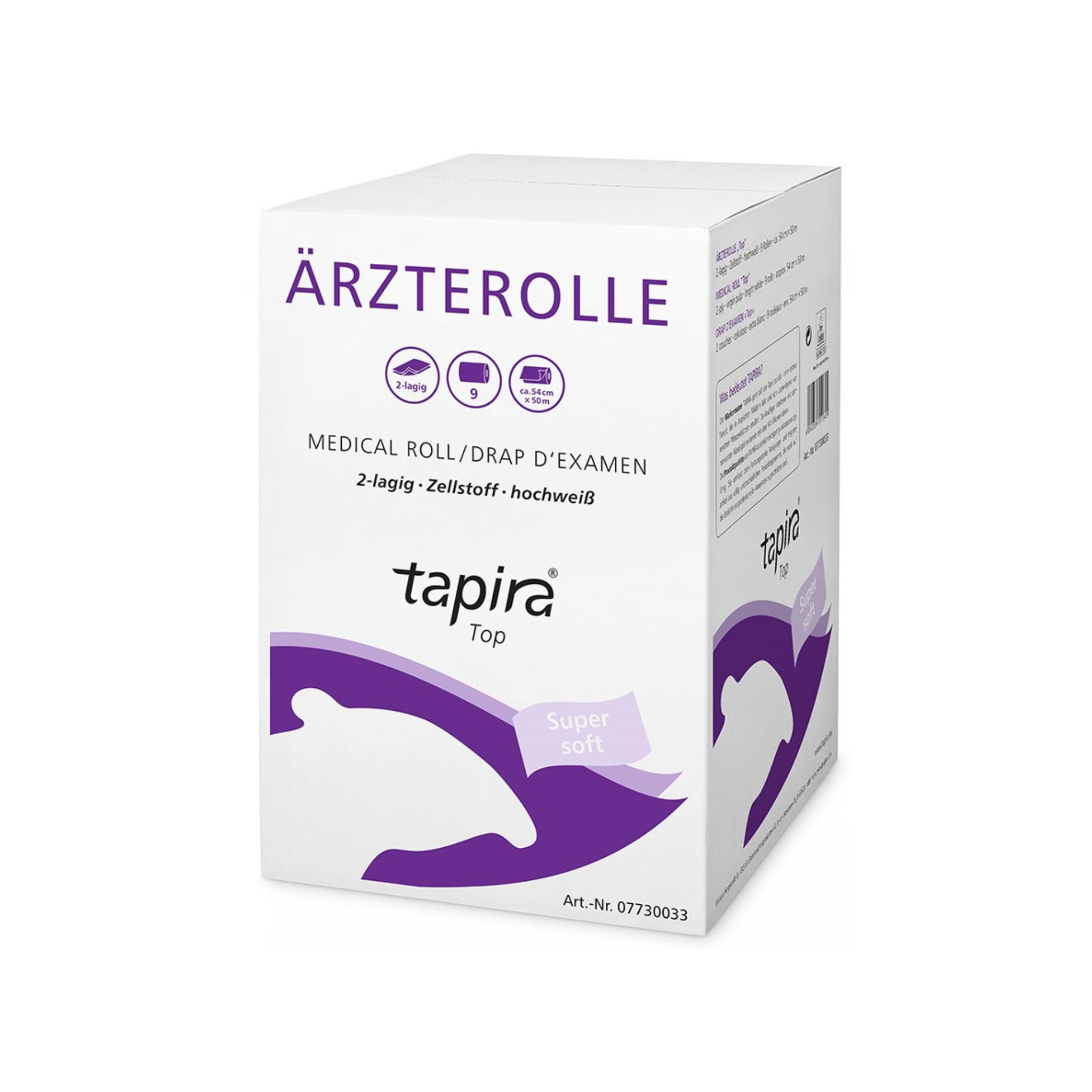 Die TAPIRA „Top“ Ärzterolle ist in mehreren Breiten erhältlich39 cm, 50 cm, 55 cm und 59 cm – jeweils bei einer Länge von 50 m pro Rolle. So lässt sich die ideale Rollengröße passend zur jeweiligen Praxisliege oder Untersuchungseinheit auswählen.